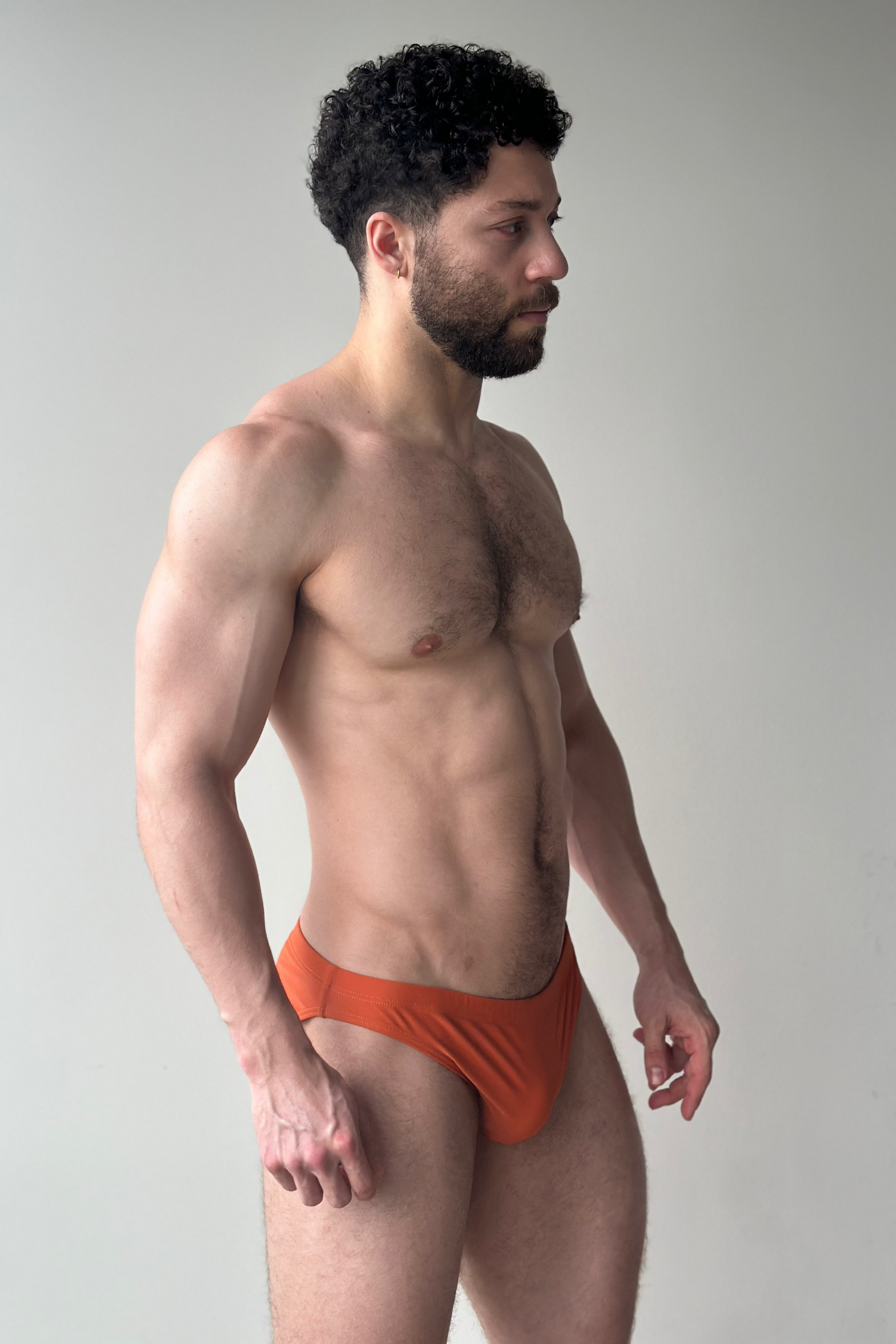 Our classic low cut hip brief now in sunset. The model in the photo is 5'10, 175 lbs, waist size 31 wearing size M.